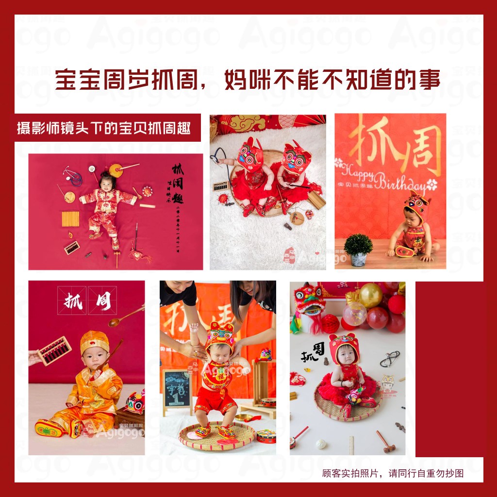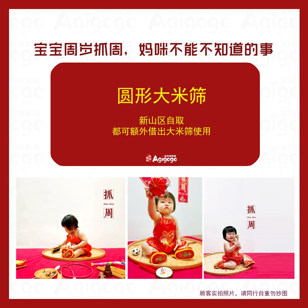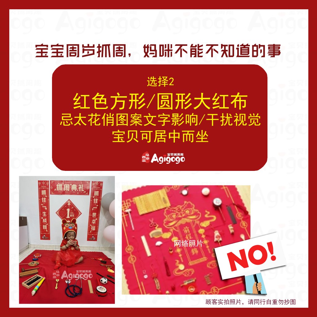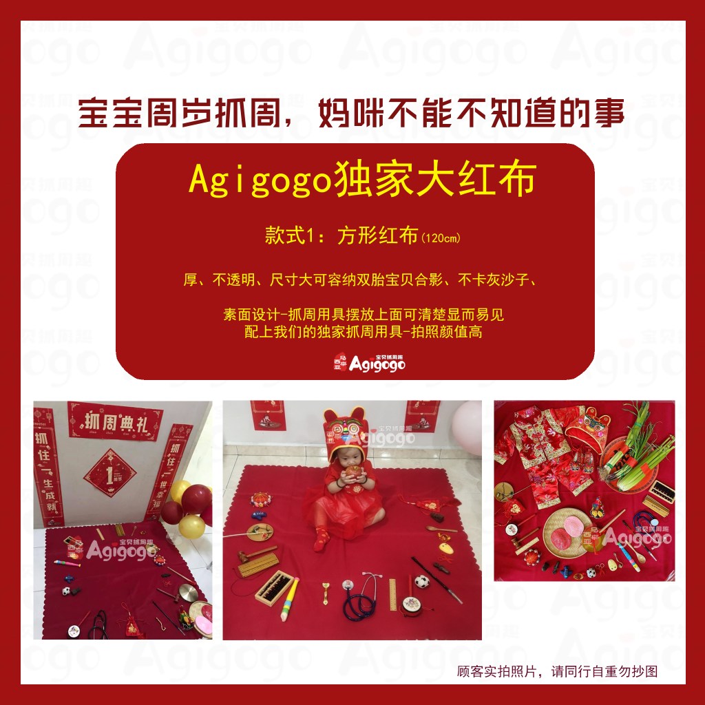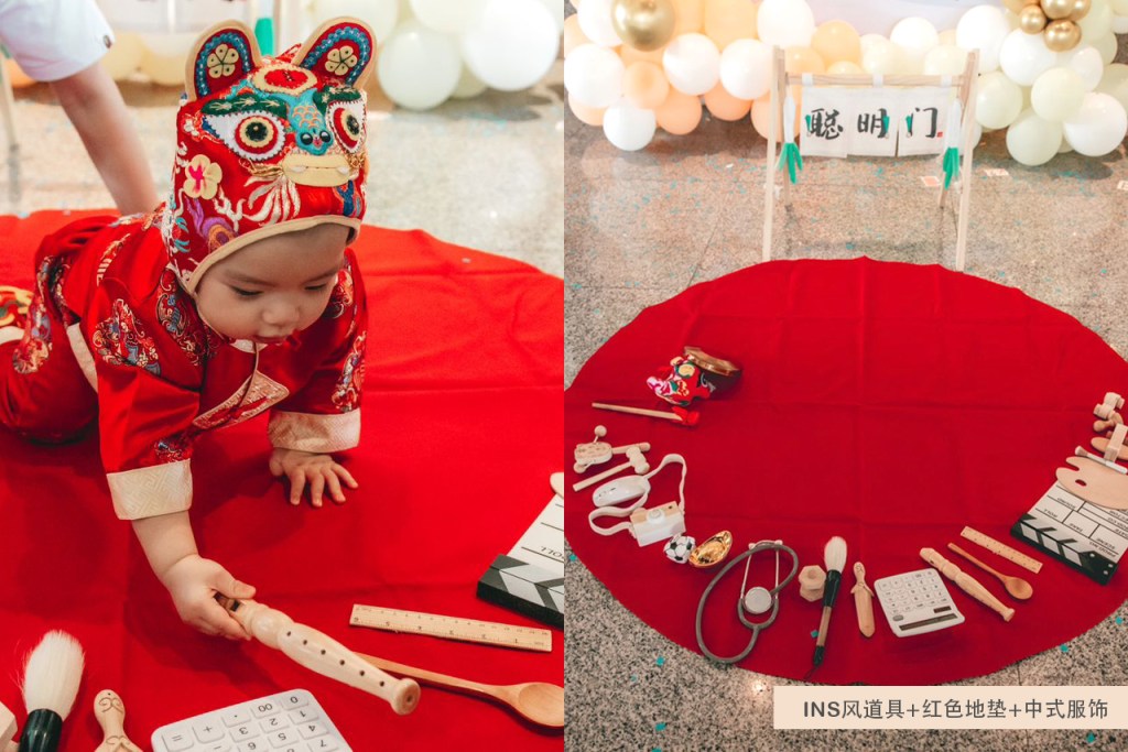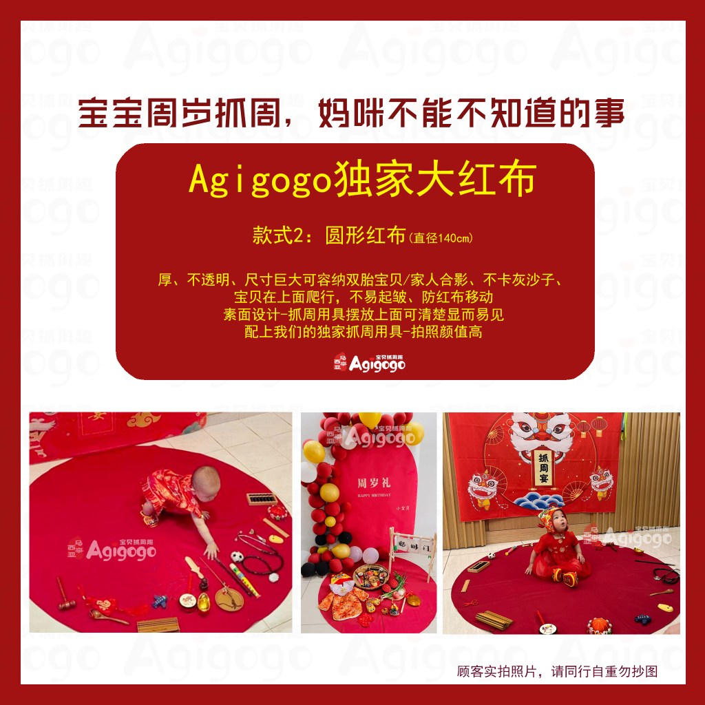 普通的红布面积小,不足以容纳宝贝与抓周用具,宝贝无法转身选择后面的道具,一转动就会造成红布起皱褶,道具就会乱作一团。地毯材质虽然避免了红布皱褶的情况,但是图案设计复杂,抓周用具放置在上面完全看不见了,